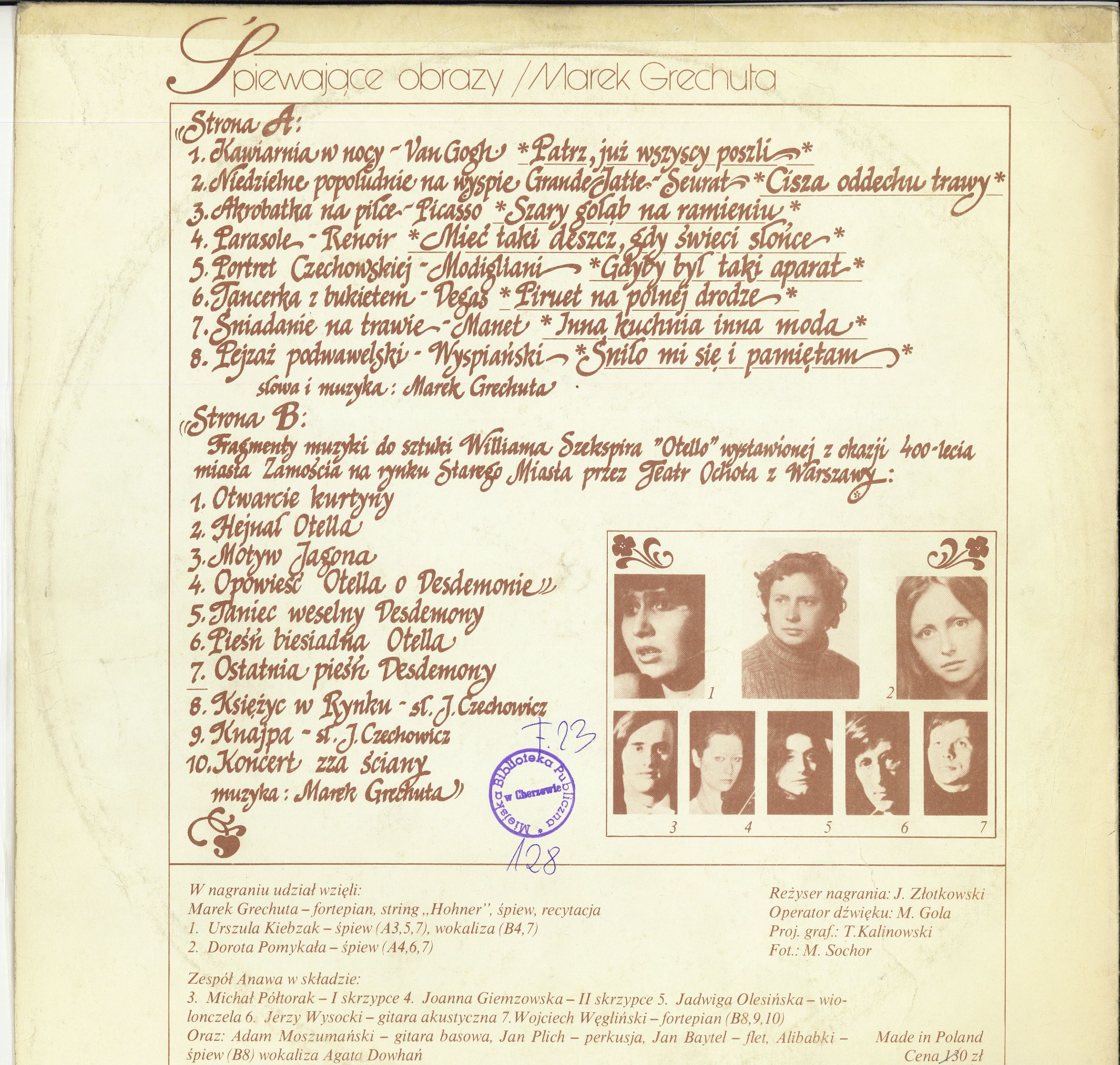 Zawiera: Strona A 1.Patrz, już wszyscy poszli; 2.Cisza oddechu trawy; 3.Szary gołąb na ramieniu; 4.Mieć taki deszcz, gdy świeci słońce; 5.Gdyby był taki aparat; 6.Piruet na polnej drodze; 7.Inna kuchnia, inna moda; 8.Śniło mi się i pamiętam;. Strona B 1.Otwarcie kurtyny; 2.Hejnał Otella; 3.Motyw Jagona; 4.Opowieść Otella o Desdemonie; 5.Taniec weselny Desdemony; 6.Pieśń biesiadna Otella; 7.Ostatnia pieśń Desdemony; 8.Księżyc w rynku; 9.Knajpa; 10.Koncert zza ściany.