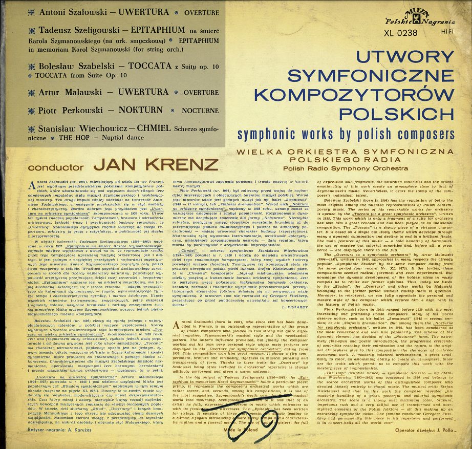Zawiera: Uwertura / Szałowski. Epitafium na śmierć Karola Szymanowskiego : na orkiestrę smyczkową / Szeligowski. Suita op. 10. Toccata / Szabelski. Uwertura / Malawski. Nokturn / Perkowski. Chmiel : scherzo symfoniczne / Wiechowicz.