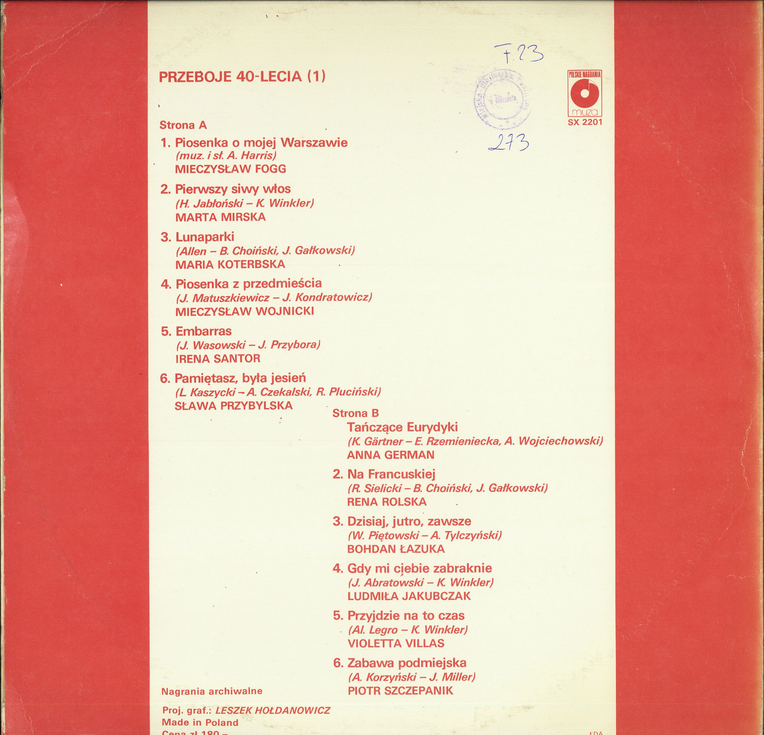 Zawiera: Strona A: Piosenka o mojej Warszawie ; Pierwszy siwy włos ; Lunaparki ; Piosenka z przedmieścia ; Embarras ; Pamiętasz, była jesień. Strona B: Tańczące Eurydyki ; Na Francuskiej ; Dzisiaj, jutro, zawsze ; Gdy mi ciebie zabraknie ; Przyjdzie na to czas ; Zabawa podmiejska.