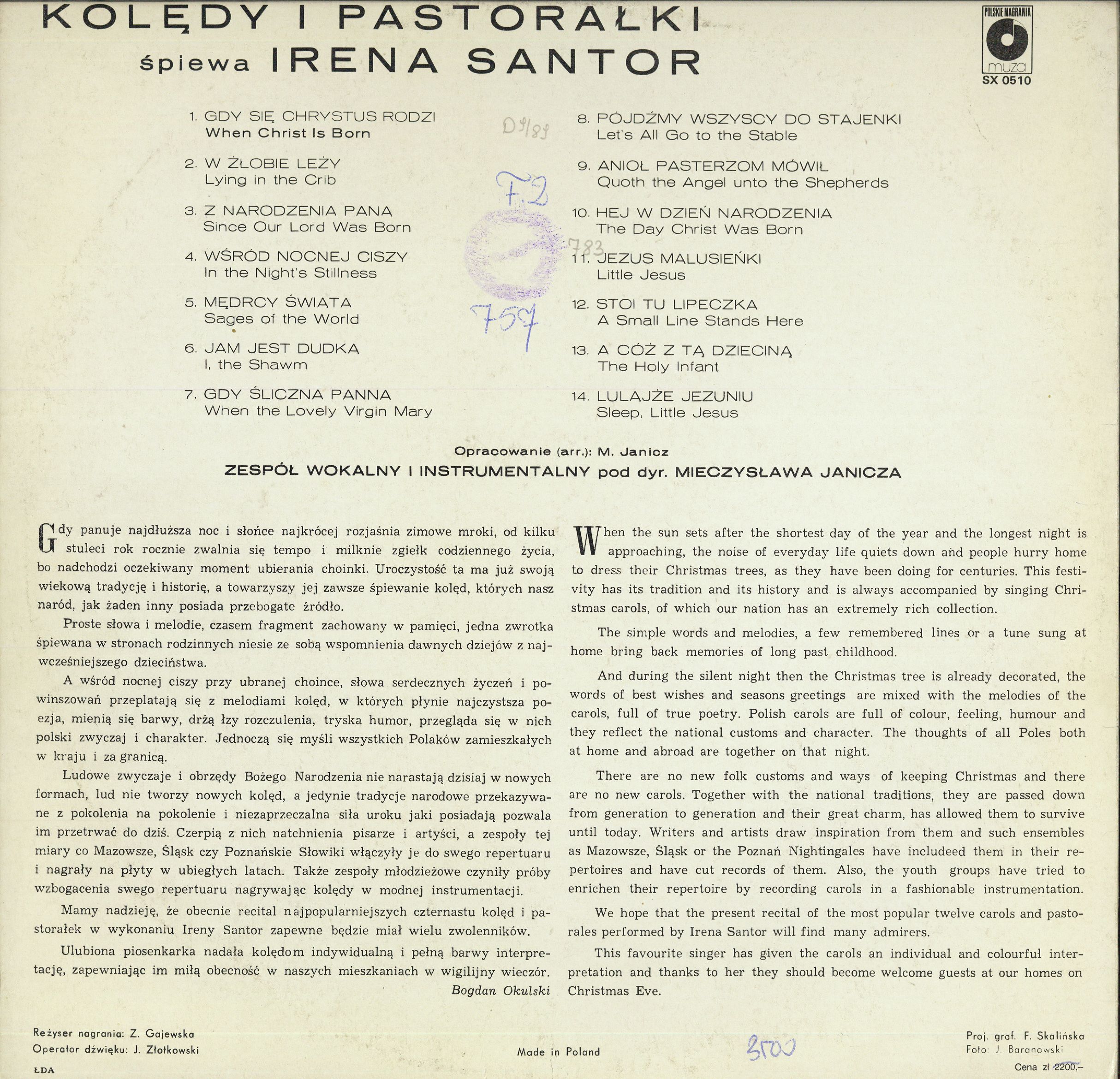 Zawiera: Strona A: Gdy się Chrystus rodzi ; W żłobie leży ; Z narodzenia Pana ; Wśród nocnej ciszy ; Mędrcy świata ; Jam jest dudka ; Gdy śliczna Panna. Strona B: Pójdźmy wszyscy do stajenki ; Anioł pasterzom mówił ; Hej w dzień narodzenia ; Jezus malusieńki ; Stoi tu lipeczka ; A cóż z tą Dzieciną ; Lulajże Jezuniu.