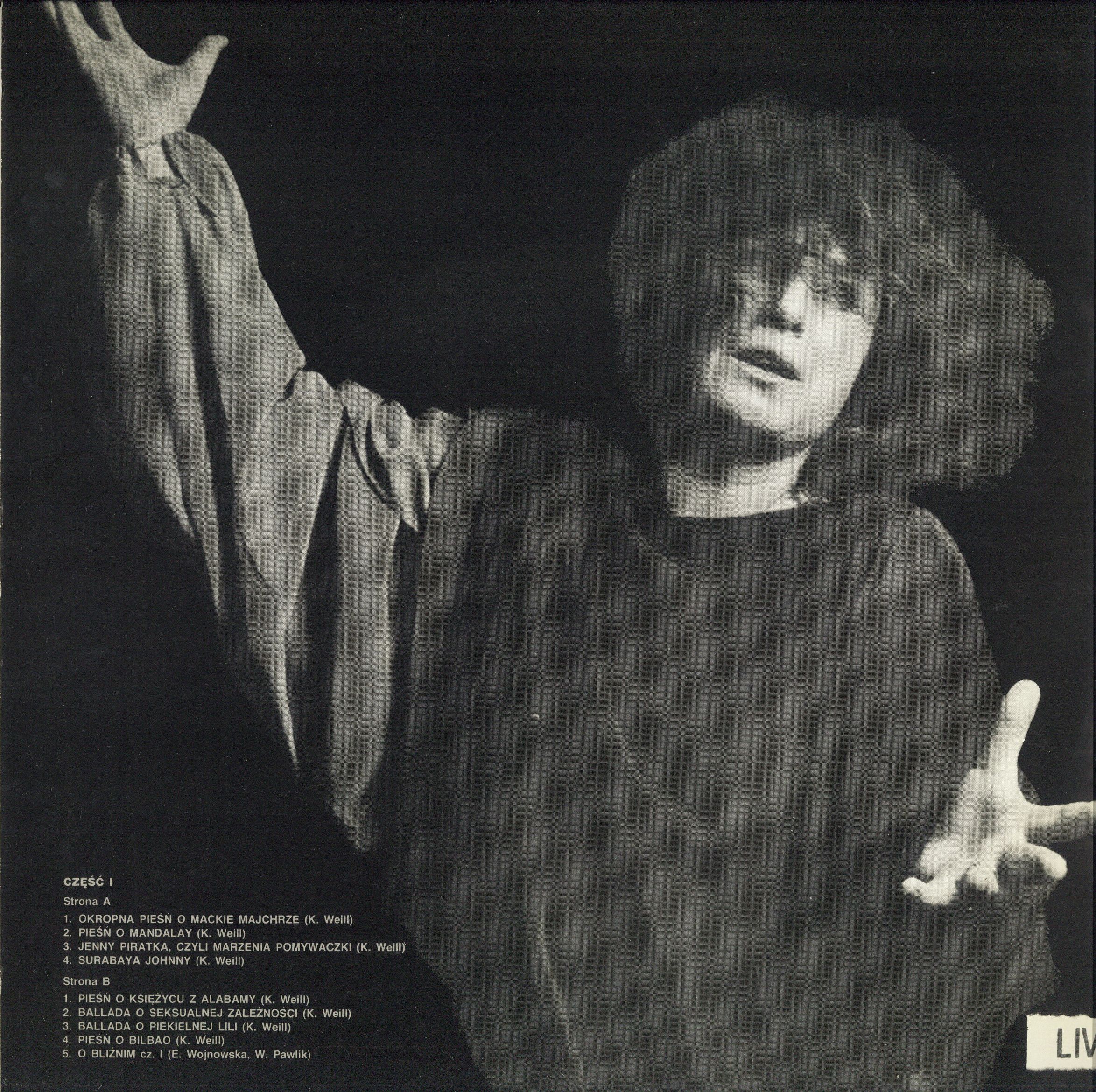 Zawiera: Płyta 1. Strona A: Okropna pieśń o Mackie Majchrze ; Pieśń o Mandalay ; Jenny Piratka czyli marzenia pomywaczki ; Surabaya Johnny. Strona B: Pieśń o księżycu z Alabamy ; Ballada o seksualnej zależności ; Ballada o piekielnej Lili ; Pieśń o Bilbao ; O bliźnim część 1.
