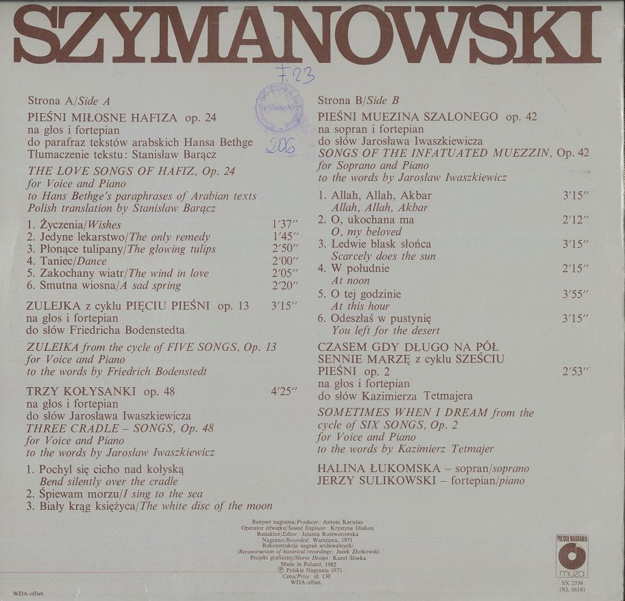 Zawiera: Strona A: Pieśni miłosne Hafiza op. 24 na głos i fortepian do parafraz tekstów arabskich Hansa Bethge, tł. Stanisław Barącz ; Zulejka z cyklu Pięciu pieśni op. 13 na głos i fortepian do słów Friedricha Bodenstedta ; Trzy kołysanki op. 48 na głos i fortepian do słów Jarosława Iwaszkiewicza. Strona B: Pieśni Muezina Szalonego op. 42 na sopran i fortepian do słów Jarosława Iwaszkiewicza ; Czasem gdy długo na pół sennie marzę z cyklu Sześciu pieśni op. 2 na głos i fortepian do słów Kazimierza Tetmajera.