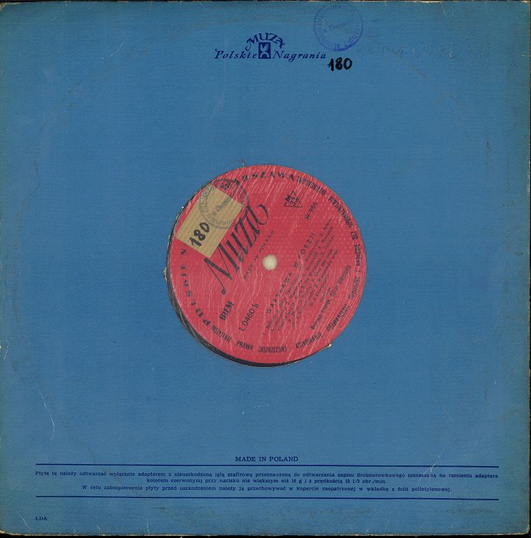 Zawiera: Strona A: Na most warszawski (J. Kochanowski) ; Gościniec, albo opisanie Warszawy 1643 r. Rynek warszawski (A. Jarzębski) ; Powązki, fragm. (S. Trembecki) ; Ofiarowanie (J. Słowacki) ; Dedykacja (C. K. Norwid) ; A tu jest Warszawa (A. Bartels) ; Z dziejów dnia ; Świt, fragm. (W. Gomulicki) ; Warszawie (M. Konopnicka) ; Zaułki (Or-Ot). Strona B: Ballada o Placu Teatralnym (W. Broniewski) ; Alarm (A. Słonimski) ; Warszawa (L. Szenwald) ; Pierwsza przechadzka (L. Staff) ; Do Warszawy (M. Jastrun) ; Złoto (J. Tuwim) ; Ona jest moja (St. R. Dobrowolski) ; Warszawski wiatr (K. I. Gałczyński).
