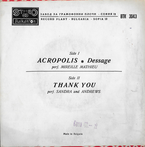 Akropolis (Dessage) ; Thank You / Mireille Mathieu ; Sandra and Andrews. - Bułgaria : Balkanton, [1974]. - 1 płyta audio : zapis analogowy, 45 obr./min., stereo ; 18 cm.