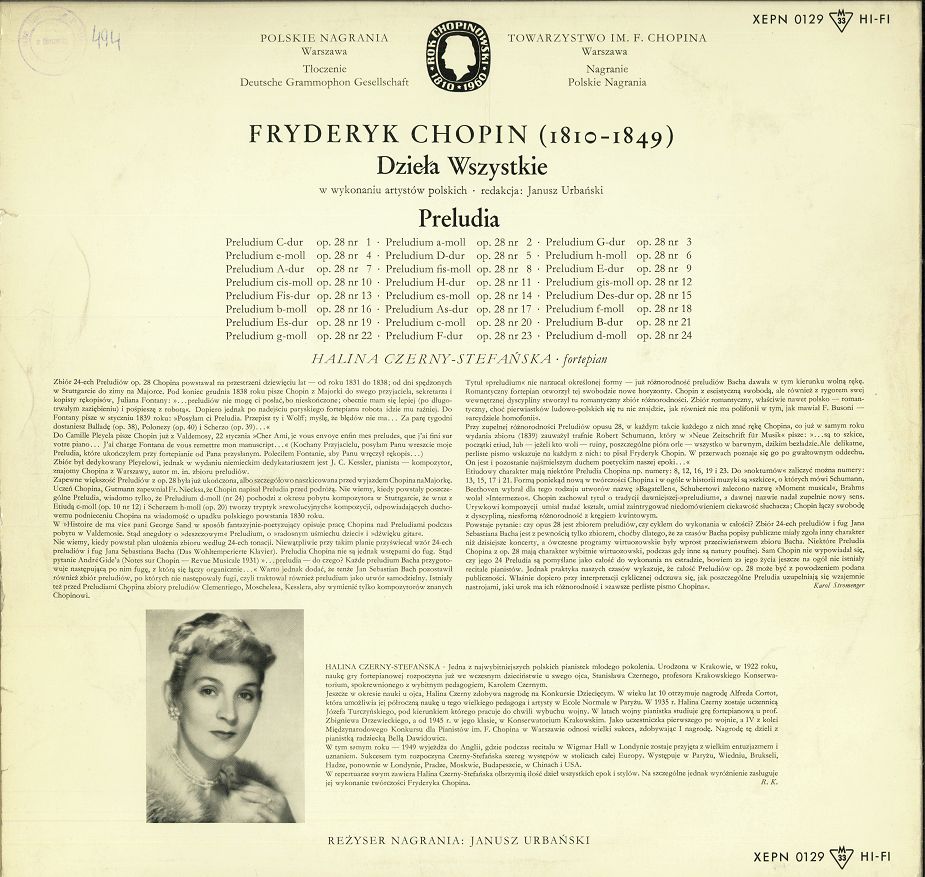 Zawiera: Preludia = Preludes Op. 28. Strona A: 1. No.1 C-dur (In C Major) ; 2. No.2 A-moll (In A Minor) ; 3. No.3 G-dur (In G Major) ; 4. No.4 E-moll (In E Minor) ; 5. No.5 D-dur (In D Major) ; 6. No.6 H-moll (In B Minor) ; 7. No.7 A-dur (In A Major) ; 8. No.8 Fis-moll (In Sharp Minor) ; 9. No.9 E-dur (In E Major) ; 10. No.10 Cis-moll (In C Sharp Minor) ; 11. No.11 H-dur (In B Major) ; 12. No.12 Gis-moll (In G Sharp Minor) ; 13. No.13 Fis-dur (In F Sharp Major) ; 14. No.14 Es-moll (In E Flat Minor). Strona B: 1. No.15 Des-dur (In D Flat Major) ; 2. No.16 B-moll (In B Flat Minor) ; 3. No.17 As-dur (In A Flat Major) ; 4. No.18 F-moll (In F Minor) ; 5. No.19 Es-dur (In E Flat Major) ; 6. No.20 C-moll (In C Minor) ; 7. No.21 B-dur (In B Flat Major) ; 8. No.22 G-moll (In G Minor) ; 9. No.23 F-dur (In F Major) ; 10. No.24 D-moll (In D Minor.