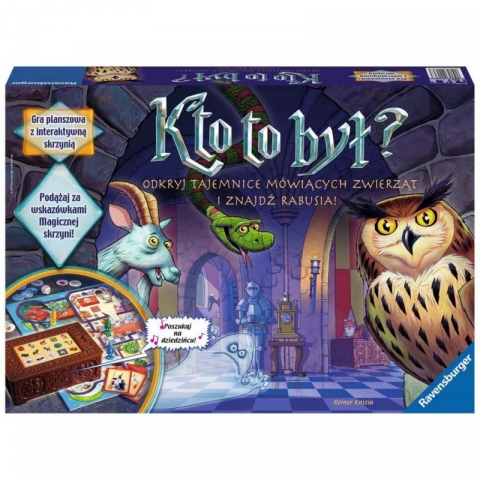 Gra przygodowa Kto to był? jest doskonałą przygodową planszówką dla całej rodziny. Ma proste zasady i trwa około pół godziny, dzięki czemu stanowi fajną rozrywkę na rodzinny wieczór. Odkryj tajemnice mówiących zwierząt i znajdź rabusia! W zamku panuje ogromna ekscytacja: ktoś skradł magiczny pierścień władcy, który chroni krainę przed złym czarnoksiężnikiem! Zwierzęta mieszkające w zamku wiedzą kim jest rabuś i mogą udzielić kilku wskazówek. Jednak tylko dzieci rozumieją mowę zwierząt, więc uratowanie królestwa leży w ich rękach. Gra polega na zwiedzaniu komnat w celu poszukiwania wskazówek, które zdemaskują złodzieja. Wskazówek udzielają zwierzęta, które chętnie podzielą się tajemnicą, jeśli dobrze je nakarmisz. Interaktywna, mówiąca skrzynia sprawia, że każda rozgrywka jest inna i bardzo ekscytująca. Posłuchaj wskazówek zwierząt, które płyną z magicznej skrzyni. Naciskaj przyciski, które pozwalają na przeszukanie komnaty, rozmowę ze zwierzęciem lub użycie magii. Tylko wspólnymi siłami odzyskacie pierścień i sprowadzicie na królestwo dobrobyt i pokój. Źródło: rebel.pl